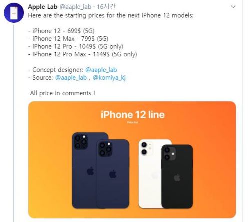 트위터 계정 애플 랩은 아이폰12 시리즈의 모델별 상세 판매가격을 입수해 28일 공개했다. 먼저 5.4인치 5G 기본 모델의 판매가격을 보면 64GB(기가바이트) 699달러(83만3000원), 128GB 749달러(89만3000원), 258GB 849달러(101만2000원)이다.